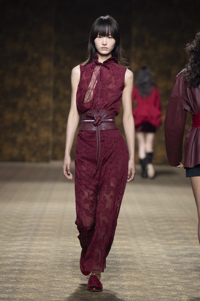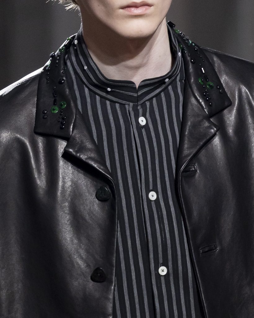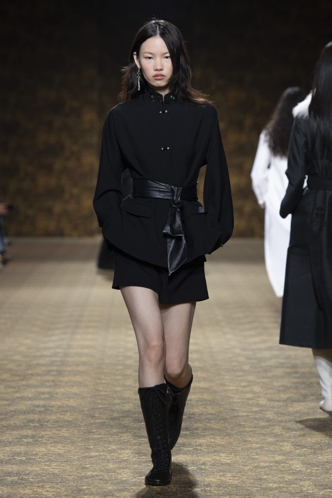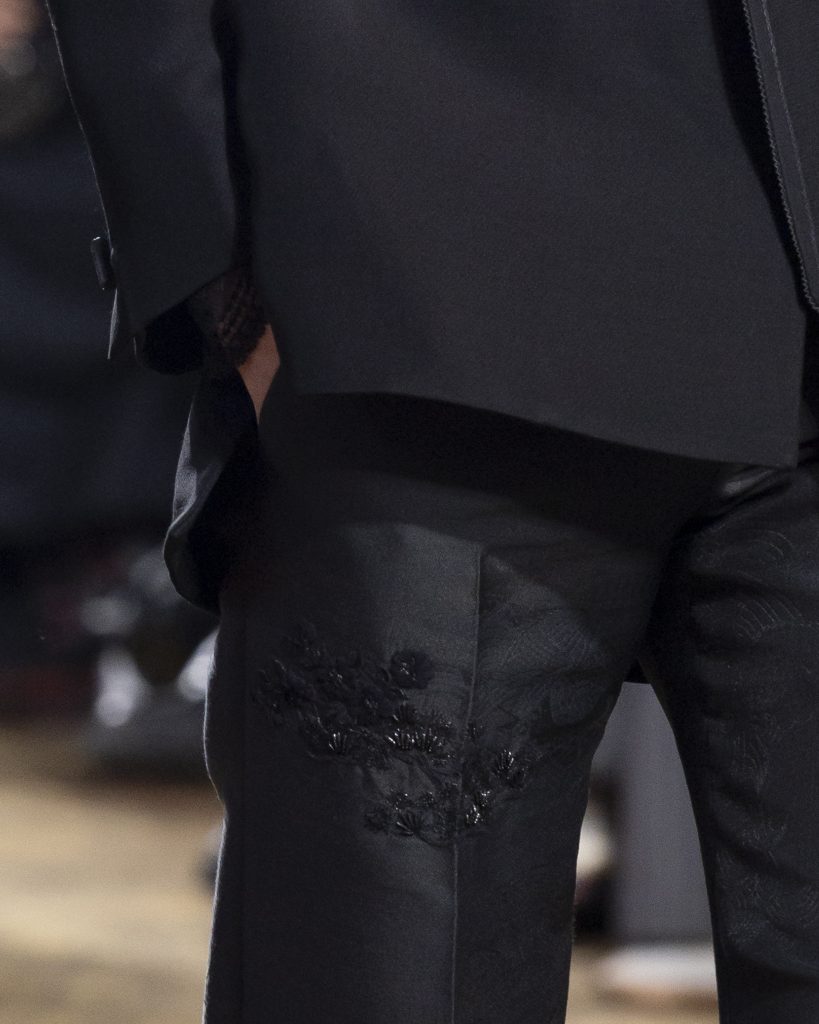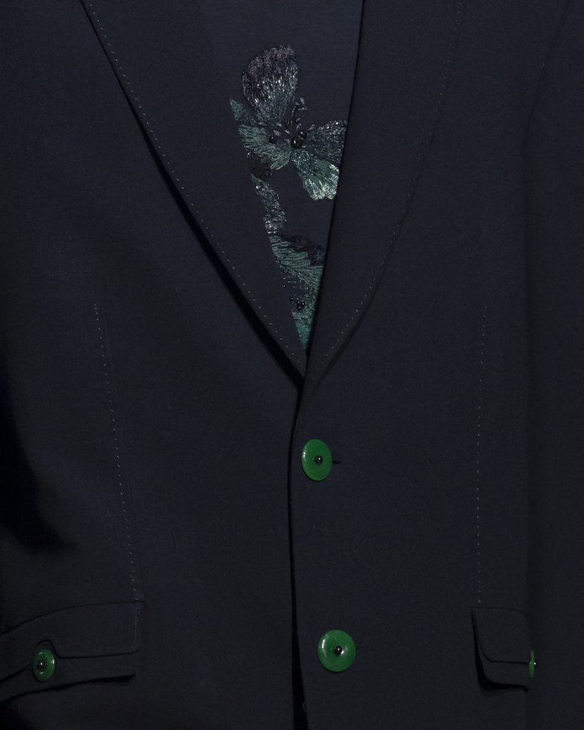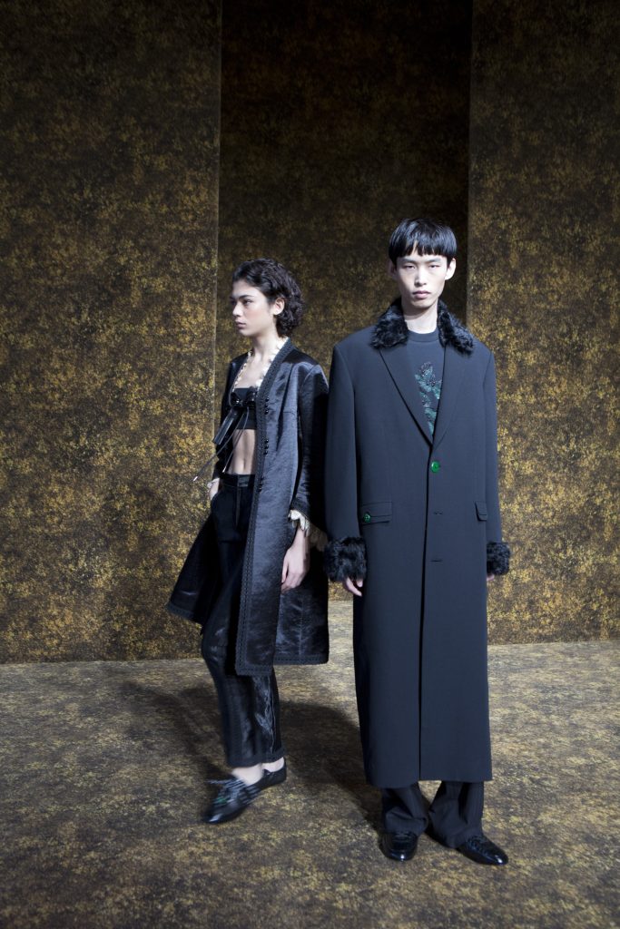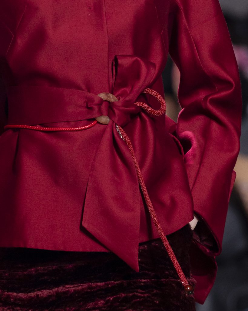 材質的碰撞更讓設計富有層次,金屬的冷冽與翻毛的溫潤交織,在冷暖之間構築出立體的視覺對比;男裝系列則延續了盛世的飽和能量,陰刻刺繡與仿舊處理讓時間在布料上留下細膩痕跡,西裝外繫腰封、方形連袖與中式鑲邊口袋的細節設計,勾勒出剛勁而內斂的男性氣質,細小玉石裝飾與毛料點綴於領口袖口,營造出如唐代壁畫般的復古質感,在歷史的厚重感與當代的簡約剪裁間,取得了精準的平衡。