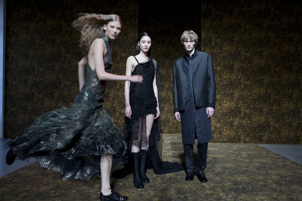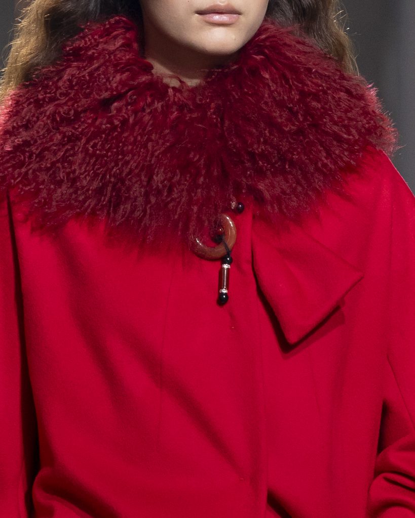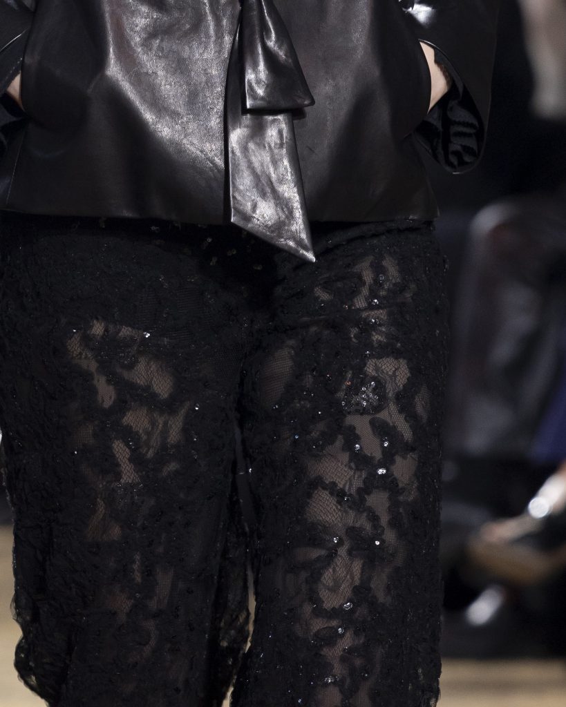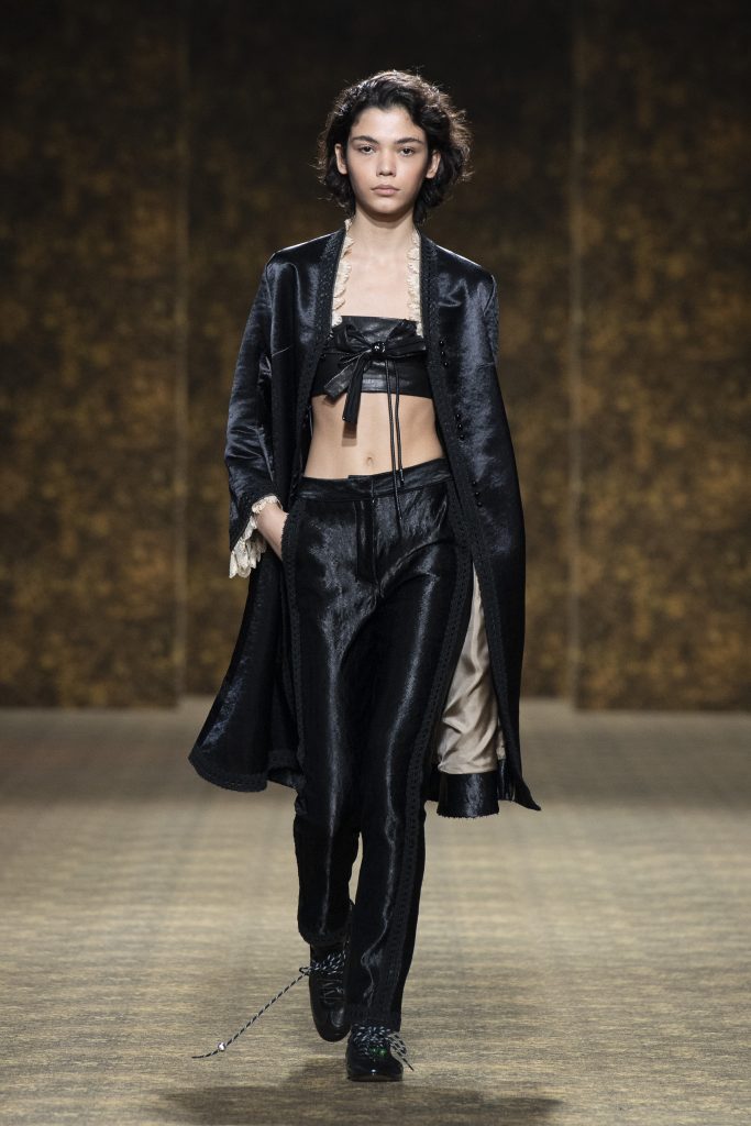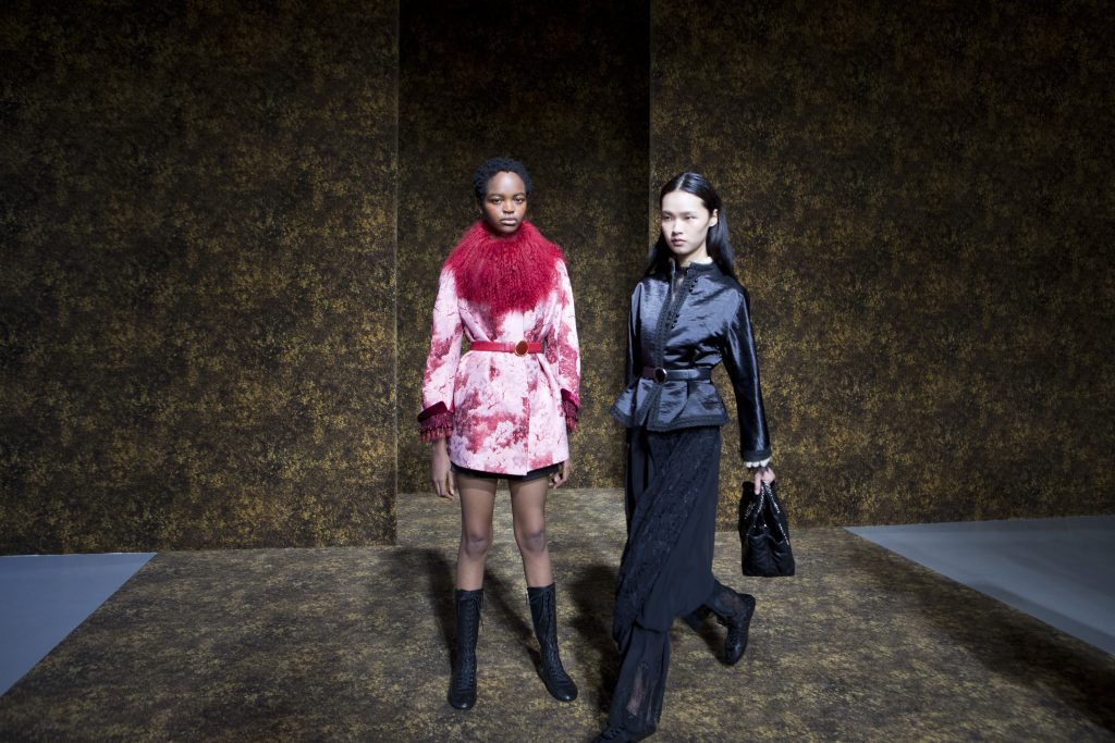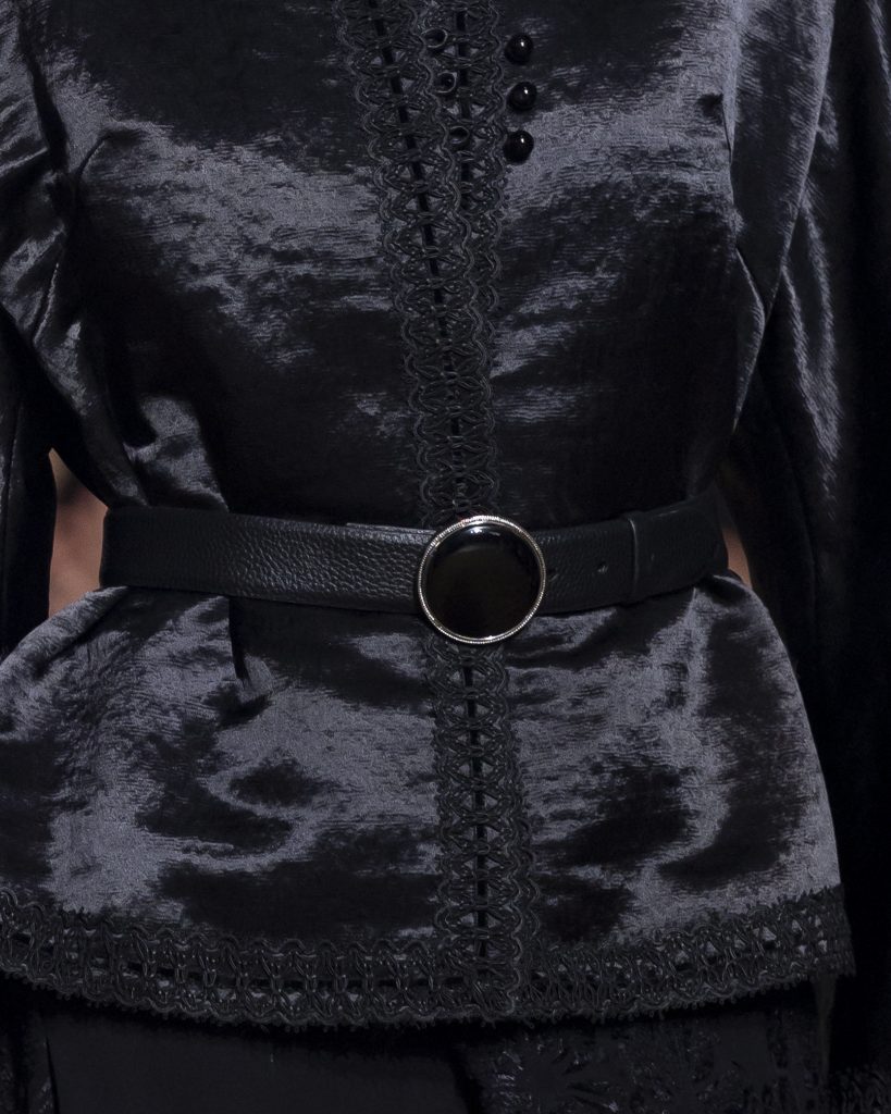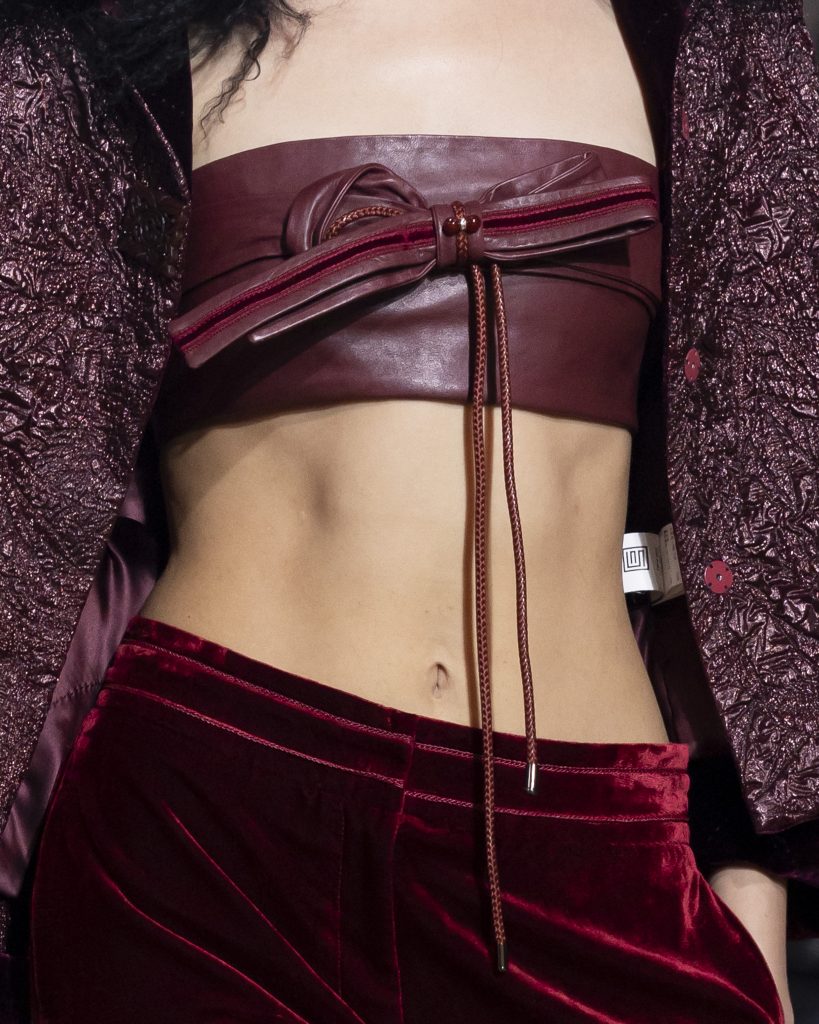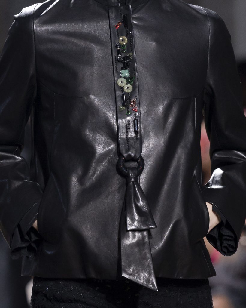 材質的碰撞更讓設計富有層次,金屬的冷冽與翻毛的溫潤交織,在冷暖之間構築出立體的視覺對比;男裝系列則延續了盛世的飽和能量,陰刻刺繡與仿舊處理讓時間在布料上留下細膩痕跡,西裝外繫腰封、方形連袖與中式鑲邊口袋的細節設計,勾勒出剛勁而內斂的男性氣質,細小玉石裝飾與毛料點綴於領口袖口,營造出如唐代壁畫般的復古質感,在歷史的厚重感與當代的簡約剪裁間,取得了精準的平衡。