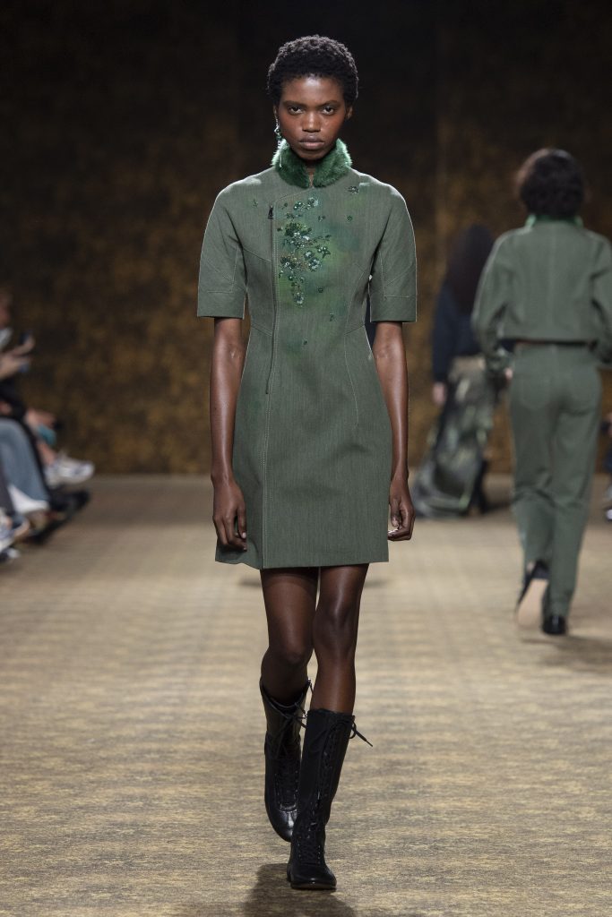玉,是本季系列無可取代的精神符碼,從細節裝飾到設計內核,玉石的溫潤與堅貞貫穿始終。小處,玉片精巧鑲嵌於刷色牛仔之上,隨步伐輕響,為日常材質注入玉石的溫潤光澤,讓平凡面料擁有了東方的雅緻意蘊;大處,經典的平安扣系於身側,化作貼膚的精神標記,寄寓著圓滿與守護的美好期許。圖騰與紋樣的設計則延續了品牌的東方美學基因,以山水、鹿紋與宮廷出遊為織錦意象,讓每一件服裝都成為一幅可隨行展開的東方畫卷;扶桑花、牡丹與團花的繁複紋樣,勾勒出盛世的繁盛流動之貌,與玉石的凝煉形成相靜相結合的美感。