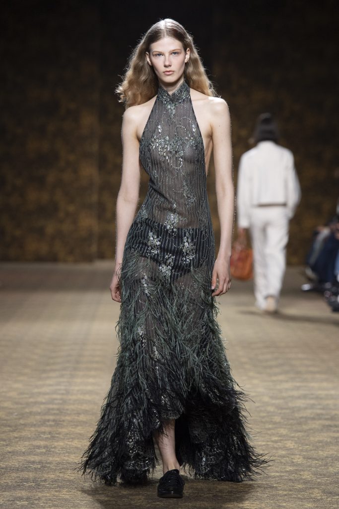 「舞玉」的誕生,根植於盛唐那個開放自信、相容並蓄的時代。多元文化的碰撞塑造了宏闊的藝術尺度,便是本季系列最深厚的文化底蘊。騷場空間如一幅穿越大唐的流動畫卷,宮廷出遊的雍容、山水行旅的悠然,隨模特兒的步履徐徐鋪展,衣裳翩躚飄逸,線條與色彩遙相呼應,將盛世風華的浪漫與磅礴,化作當代時尚的鮮活表達。