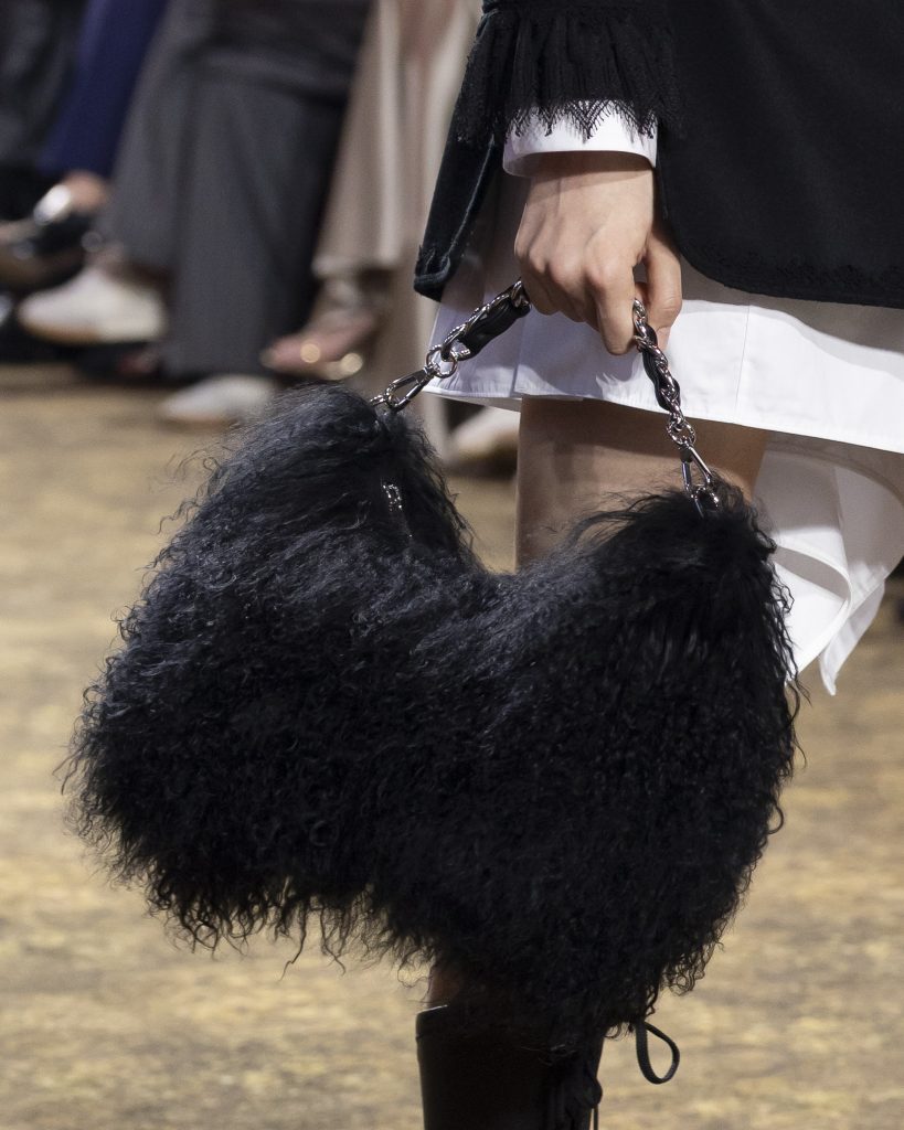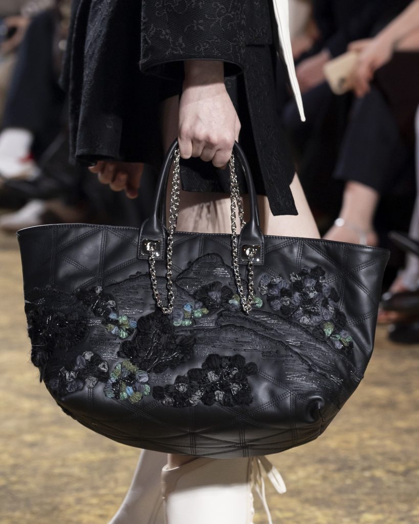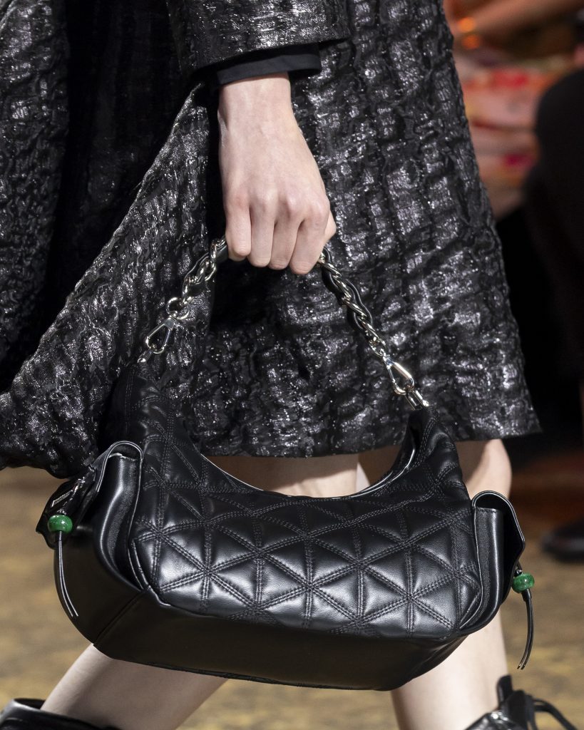 本季品牌也推出多款全新包款,無一不彰顯東方美學與當代實用的結合:長型包取玉手鐲的經典輪廓,以金龜子綠、紅與白構築出鮮明的視覺識別,山水圖案與毛線釘繡工藝術融合,讓包款成為可攜行的東方畫卷;化妝包以玉質提把結合鏡面語匯,精緻而優雅;元寶型包款則以毛海材質呈現出溫潤的量感,巧妙呼應了唐代繪畫的裝飾精神。鞋款設計亦紮根傳統,沿用唐代扁底鞋的經典結構打造,從平底鞋、球鞋到纏帶跟鞋,讓傳統之美融入日常行走。