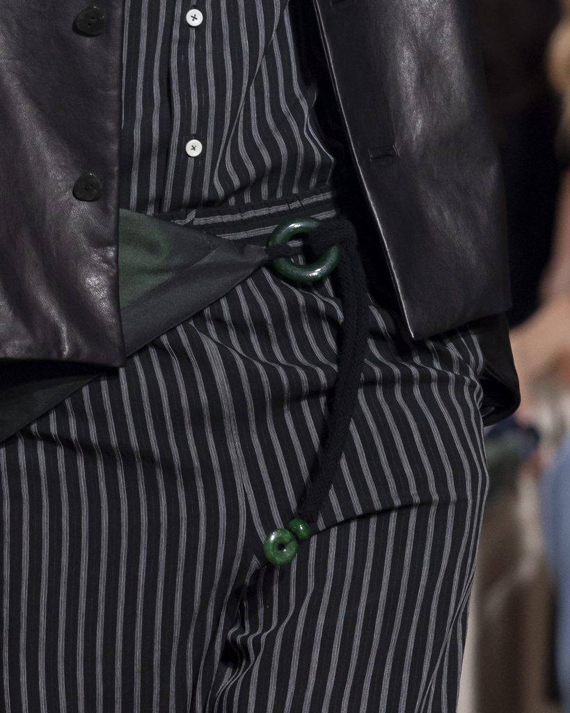 配件設計則是「舞玉」精神的延伸與昇華,所有細節皆圍繞玉的圓融精神展開,將圓滿、流轉與守護的美好寓意藏於方寸之間。平安扣、玉珠、玉片與玉鍊的圓形意象,成為配件設計的核心元素,項鍊可靈活轉換為別針,讓玉的美好在不同佩戴方式間自由切換。
