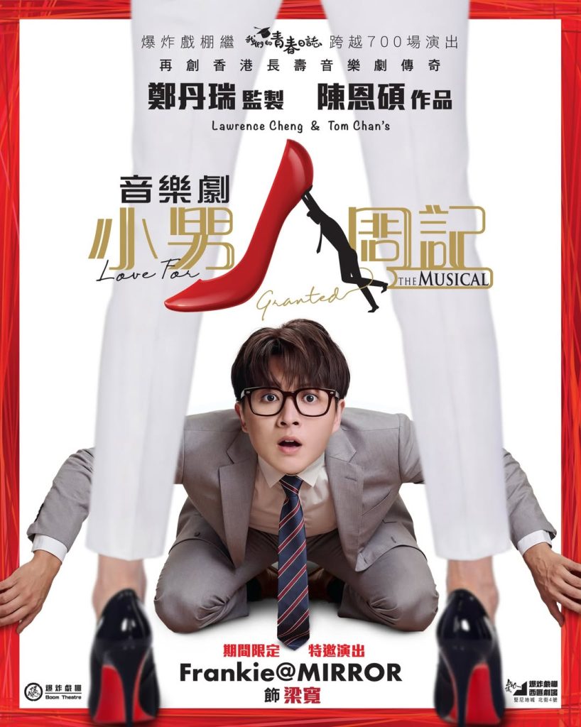 爆炸戲棚長壽音樂劇《小男人周記》自去年9月公演,熱演之際,劇組驚喜宣佈請來陳瑞輝(Frankie )作期間限定特邀演出,演繹經典小男人梁寬。隨著排練愈發熟練,Frankie亦分享了不少成為「梁寬」的幕後故事——從解讀角色的「香港人特質」,到突破舞台劇節奏與獨唱挑戰,再到在不同梁寬版本中找到專屬風格,他將「小男人」的內心世界層層剖開,也袒露了自己在舞台上的成長與期待。