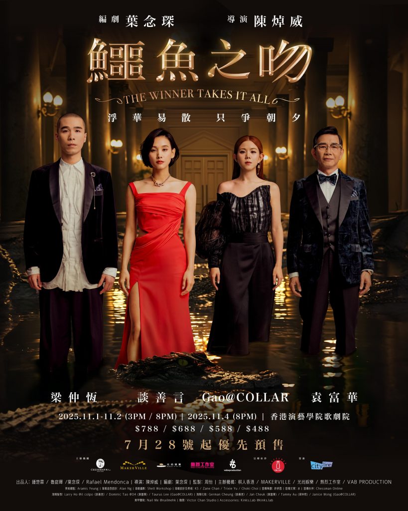 演員的出身五花八門,就像今次《鱷魚之吻》、梁仲恆遇上不少非舞台劇出身的演員合作,包括首次參與舞台劇的「影后」談善言及COLLAR隊長Gao沈貞巧。「香港這幾年,都有很多未接觸過舞台劇的明星,他們會去參與舞台製作,其實我覺得是一件好事,希望能將更多觀眾帶入劇場。」梁仲恆在劇中要飾演一個需要在野心與共情間找到平衡的角色。「複雜在於他有一個平衡位要拿捏,他是一個很想躋身上流社會、很想成功的人,但如果只是個投機或機會主義者,其實是沒甚麼好看的。所以,演員就要在戲劇裡找一些觀眾能夠跟他共情的位置,不能夠只是做一隻野獸。」