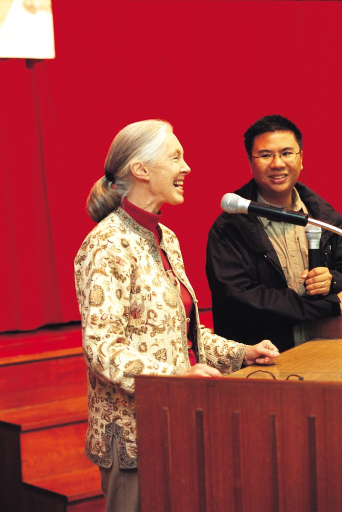 眼前的Jane Goodall,剛被《時代雜誌》歐洲版推選為2004英雄之一,是全球最權威的黑猩猩(Chimpanzee)研究權威。她今年七十歲,沒絲毫老態,五官依然輪廓分明依然很漂亮。看著她竟然會聯想起柯德莉夏萍,比明星更明星的氣質不是來自於身上時服或濃妝豔抹,那是她四十年以來對猿猴類的專注和沉醉,是她鍥而不捨地在全球推展關注和保育地球工作的那份義無反顧。
