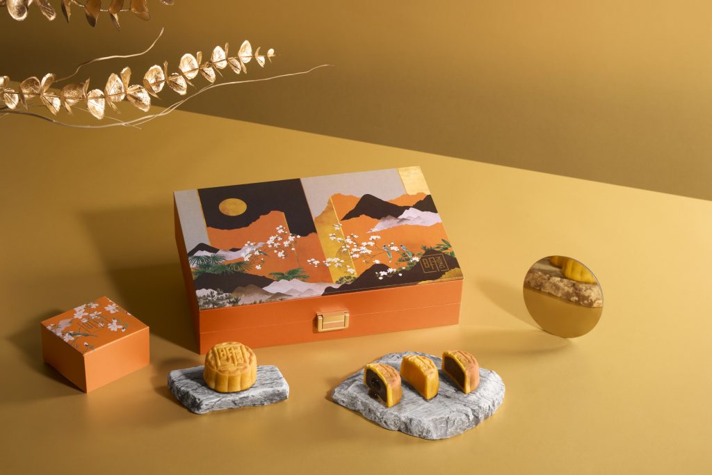 粵菜食府明閣(香港康得思酒店)及明閣(灣仔)大師級廚藝團隊特別呈獻精心調製的明月餅,而別出心裁的禮盒以首飾錦盒設計,印有金秋花滿月盈的雅致水墨畫作,圓月與繁花互相輝映,綴以喜慶的桔子色調及細緻燙金工藝。其中精選三種口味的迷你錦繡月餅拼盒(六件裝),包括迷你流心黑芝麻月餅、迷你奶黃月餅、迷你陳皮豆沙月餅為這個特別節日增添甜蜜滋味。
