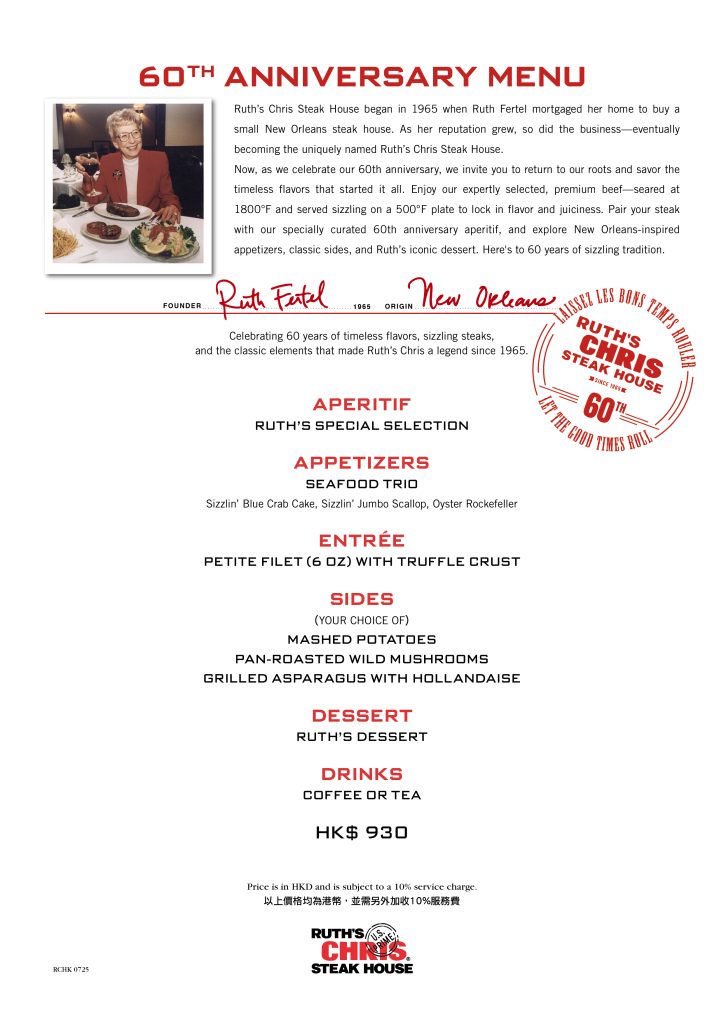 香港素有不少美式牛扒店,經典扒房Ruth’s Chris Steak House可說是其中一間,以精選熟成美國頂級牛肉聞名,1997年來港開店,至今已是28年,而品牌早於1965年在美國路易斯安那州新奧爾良創立,今年更是60周年,現已擁有超過150間分店遍布世界各地。為慶祝開業60周年,今個10月、11月推出60周年限定菜單,呈獻多款經典精緻的菜餚,一同慶祝60年!
