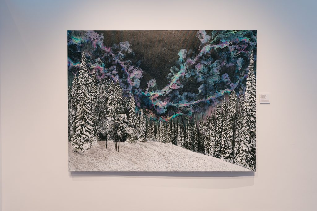 小時候看姆明卡通,只覺得可愛;長大後才知道作者Tove Jansson是芬蘭人,故事背景在芬蘭森林。我沒去過芬蘭,但一直好憧憬那裡的雪景和極光,這幅畫就是幻想姆明在芬蘭的極光夜空下生活。我故意不用「正常」的綠色極光,用很奇幻的顏色,因為姆明的世界本身就是很奇幻、很神秘、我們永遠觸不到的感覺。